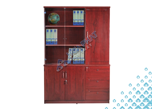 + Phần trên bao gồm 2 khoang cánh kính khung gỗ, trong có 2 đợt để tài liệu và 1 ngăn cánh gỗ mở, có khóa, mang lại sự tiện dụng cho người dùng